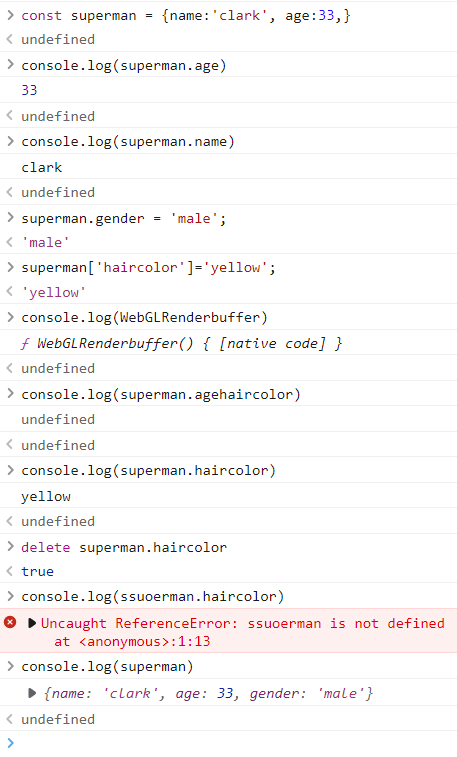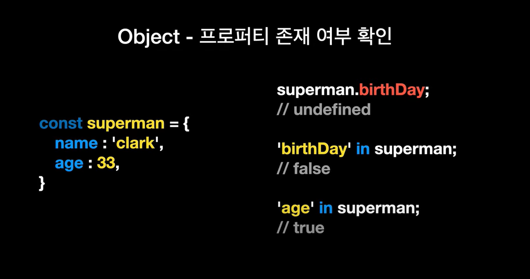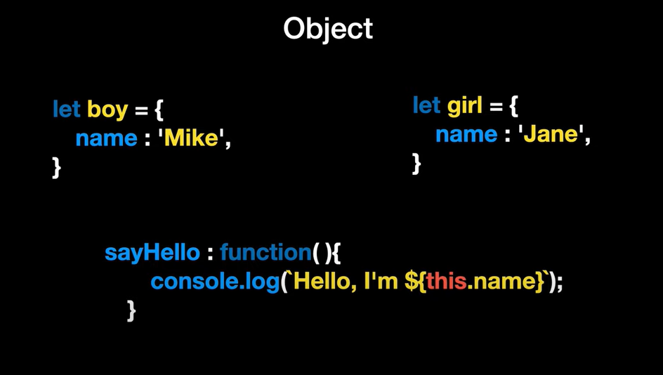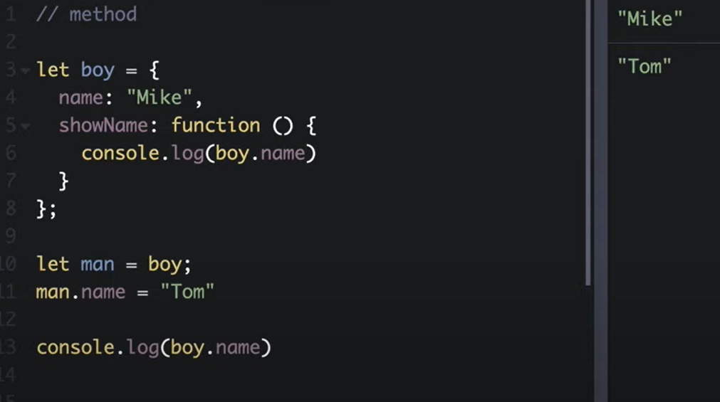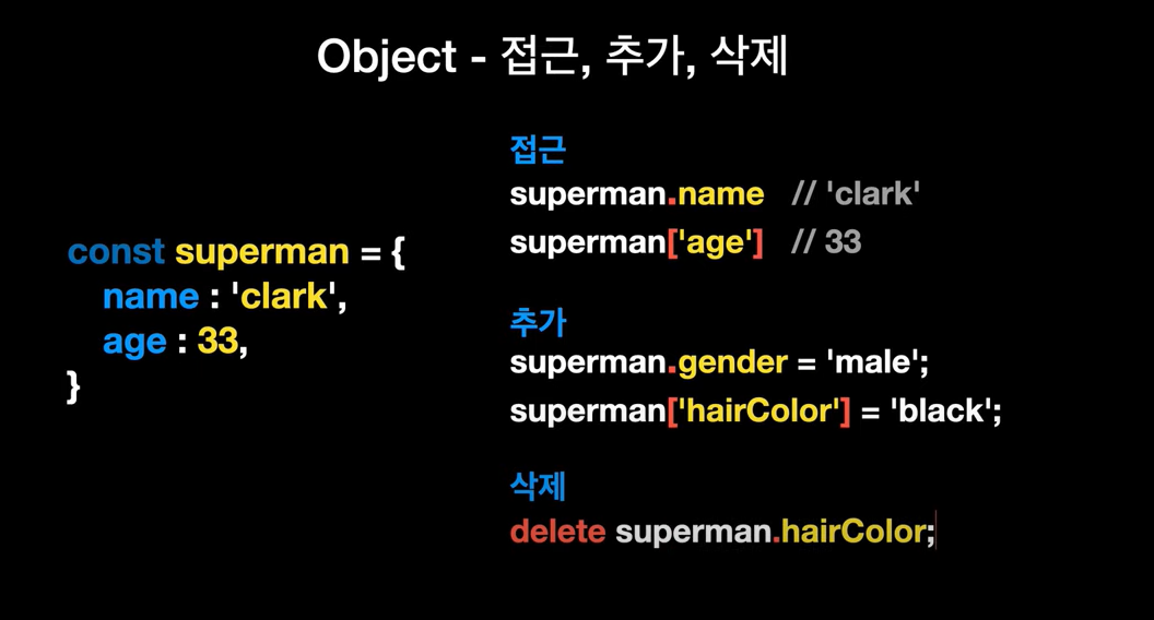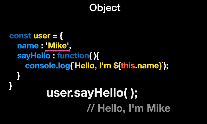 let user = { name: "Hong", age: 22, getName : function(){ return "My name i "+this.name } }; // ๊ฐ์ฒด ์ ์๋ฒ console.log(user.name) // ๊ฐ์ฒด์์ ๊ฐ ๊ฐ์ ธ์ค๋ ๋ฒ 1 console.log(user['name']) // ๊ฐ์ฒด์์ ๊ฐ ๊ฐ์ ธ์ค๋ ๋ฒ 2 user.age = 40 // ๊ฐ์ฒด์ ํน์ ํค ๊ฐ์ ๋ฐ๊พธ๋๋ฒ 1 user['age']=50 // ๊ฐ์ฒด ํน์ ํค ๊ฐ์ ๋ฐ๊พธ๋๋ฒ 2 console.log(user.getName()) // ๊ฐ์ฒด์ ํจ์ ํธ์ถ