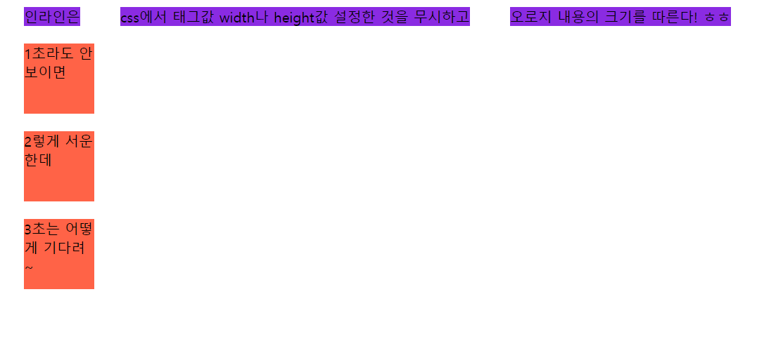 - inline(๋ฌผ๊ฑด ์์ฒด) : inline์ ์ปจํ ์ธ (๋ด์ฉ)์์ฒด๋ง์ ๊พธ๋ฉฐ์ฃผ๋ ๊ฒ์ด๋ค.(๊ธฐ์กด์ width, height ์ค์ ํ ๊ฒ์ผ ๋ฌด์ํ๊ณ ์ค๋ก์ง ์ปจํ ์ธ ์ ๊ธธ์ด, ํฌ๊ธฐ์ ๋ง์ถฐ์ ๋ณ๊ฒฝ๋๋ค.) ๋ฐ๋ผ์ ๋ด์ฉ์ด ์์ผ๋ฉด ์๋ฌด ๊ฒ๋ ๋ ๋๋ง๋์ง ์๋๋ค.