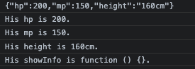 console.log(JSON.stringify(player1)); //{"hp":200,"mp":150,"height":"160cm"}