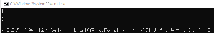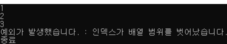 i๊ฐ 3์ด ๋๋ฉด IndexOutOfRangeException ๊ฐ์ฒด๊ฐ ๋์ ธ์ง๊ณ catch ๋ธ๋ก์ด ์ด๋ฅผ ๋ฐ์๋ธ๋ค.