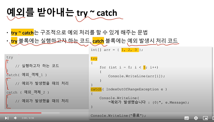 ์์ ์์ ํ๋ก๊ทธ๋จ์์ ๋ฐฐ์ด์ด IndexOutOfRangeException ์์ธ๋ฅผ ๋์ก๋๋ฐ Main()๋ฉ์๋๊ฐ ์ฒ๋ฆฌํ์ง ๋ชปํ๋ค. ์ด ๋ฌธ์ ๋ฅผ ํด๊ฒฐํ๋ ๋ฐฉ๋ฒ์ ์์ธ๋ฅผ Main()๋ฉ์๋๊ฐ '๋ฐ์ผ๋ฉด'๋๋ค. C#์์๋ ์์ธ๋ฅผ ๋ฐ์ ๋ try~catch๋ฌธ์ ์ด์ฉํ๋ค.
