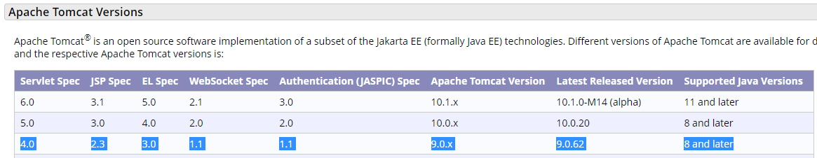Apache Tomcat® is an open source software implementation of a subset of the Jakarta EE (formally Java EE) technologies. Different versions of Apache Tomcat are available for different versions of the specifications. The mapping between the specifications and the respective Apache Tomcat versions is: