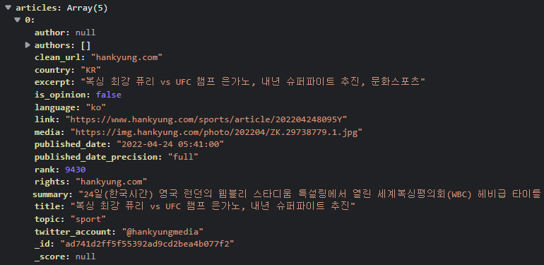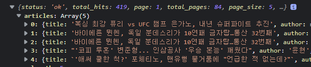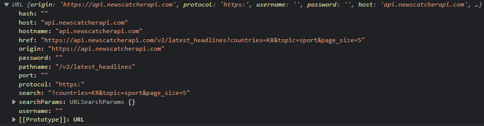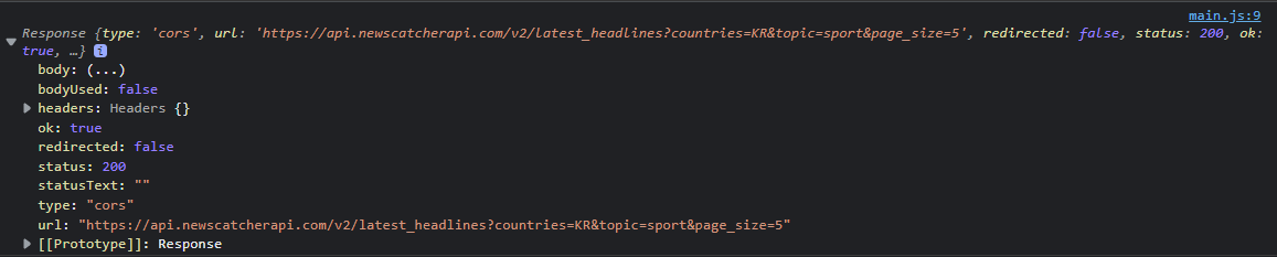 Response {type: 'cors', url: 'https://api.newscatcherapi.com/v2/latest_headlines?countries=KR&topic=sport&page_size=5', redirected: false, status: 200, ok: true, …} body: ReadableStream bodyUsed: false headers: Headers {} ok: true redirected: false status: 200 statusText: "" type: "cors" url: "https://api.newscatcherapi.com/v2/latest_headlines?countries=KR&topic=sport&page_size=5" [[Prototype]]: Response