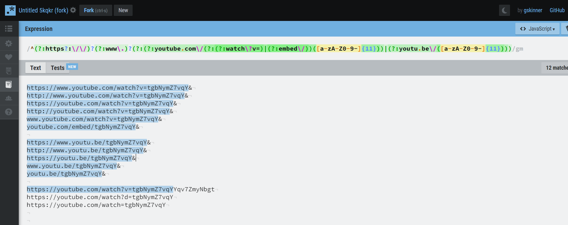 /^(?:https?:\/\/)?(?:www\.)?(?:(?:youtube.com\/(?:(?:watch\?v=)|(?:embed\/))([a-zA-Z0-9-]{11}))|(?:youtu.be\/([a-zA-Z0-9-]{11})))/;