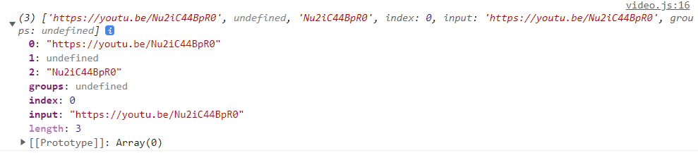 const videoId = match ? match[1] || match[2] : undefined; //๋งค์น๋๊ฒ ์์, ์ฆ undefined์ด ์๋๋ผ๋ฉด ๋งค์น๋ ๋ฐฐ์ด ์ฒซ๋ฒ์งธ ์ธ๋ฑ์ค, ์ฒซ๋ฒ์งธ๊ฐ ์๋ค๋ฉด ๋๋ฒ์งธ๋ก ๋งค์น๋ ๊ฒ์ ์ธ ๊ฒ, ๊ทธ๋ผ์๋ ์ ์ฒด์ ์ผ๋ก ๋งค์น๋๊ฒ ์๋ค๋ฉด undefined