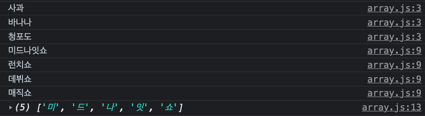 - new 이용 : let shows = new Array('미드나잇쇼','런치쇼','데뷔쇼','매직쇼');