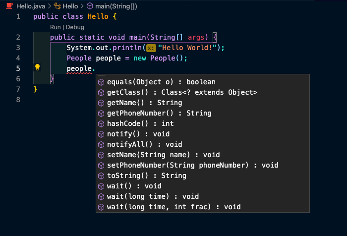 ๊ทธ ์ธ์คํด์ค์ ์ฉ(.)์ ์ฐ์ผ๋ฉด ์๋ํฐ์์ ์ ์๋ ์ฝ๋๊ฐ ์๋ ๋ฉ์๋๋ค์ ๋ง์ด ๋ณผ ์ ์๋ค.