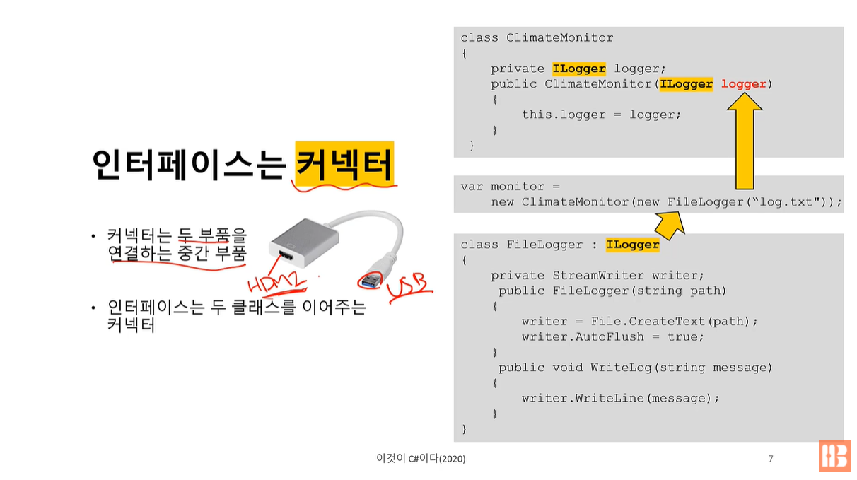 (์์์ ILogger ์ธํฐํ์ด์ค๋ฅผ ์์๋ฐ๋ ConsoleLogger ํด๋์ค๋ฅผ ์ ์ธํ์ฌ ์ฝ์์ ๋ก๊ทธ๋ฅผ ์ถ๋ ฅํ๋๋ก WriteLog() ๋ฉ์๋๋ฅผ ๊ตฌํํ๋๋ฐ, ์ด ์ธ์๋ ์ผ๋ง๋ ์ง ILogger๋ฅผ ์์๋ฐ๋ ์๋ก์ด ํด๋์ค๋ฅผ ์ ์ธํด์ ํ์ผ์ ๋ก๊ทธ๋ฅผ ์ถ๋ ฅํ๋๋ก ํ ์ ์๊ณ ๋คํธ์ํฌ ๋๋จธ์ ์๋ ์๋ฒ์ ์ ์ฅํ๋๋ก ํจํท์ ๋ณด๋ผ ์๋ ์๋ค.)