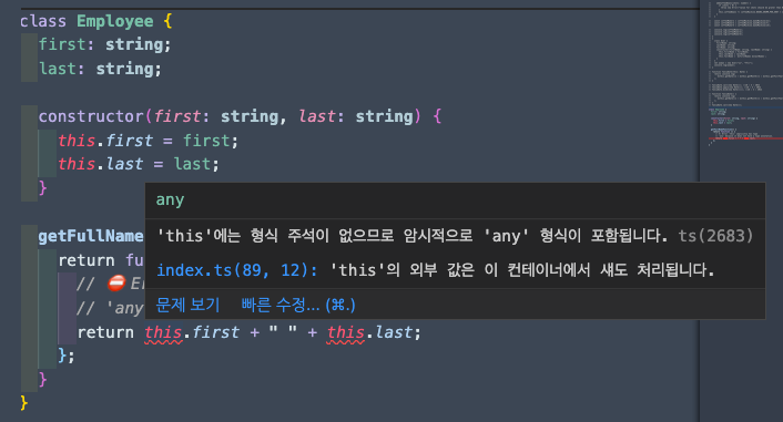 TypeScript์์ 'this'๊ฐ ์์์ ์ผ๋ก 'any' ์ ํ ์ค๋ฅ๋ฅผ ๊ฐ์ง๋๋ค : ํด๋น ์ค๋ฅ๋ฅผ ์ดํดํ๊ณ ์ ์ ํ๊ฒ ์ฝ๋๋ฅผ ๊ณ ์น๊ธฐ ์ํด ์๋ ๋ธ๋ก๊ทธ ํฌ์คํ ์ ์ฐธ๊ณ ํ๋ค.